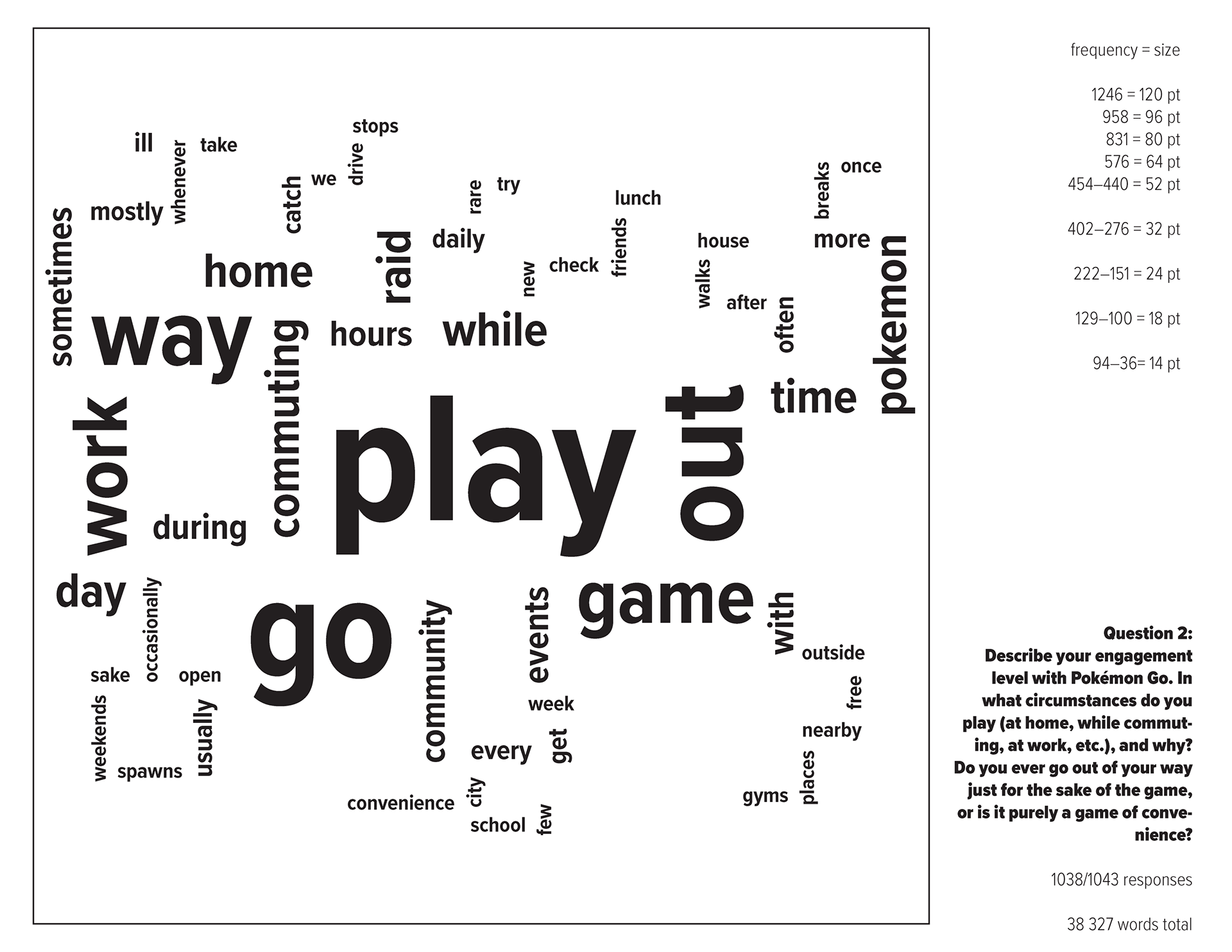 One common feedback I received was that my questions were wordy and imprecise. Some questions were actually several in one (esp. Q1), which was confusing and difficult to code. In addition, I’d inadvertently prejudiced the open-ended responses by listing examples of things to mention (Q4 & Q5)—which meant they were over-represented in the analysis. I had intentionally avoided collecting any quantitative data (e.g. demographics, Likert scales, multiple/ranked choice), but due to sheer volume, this was a missed opportunity. A question I wish I’d asked was a simple “Describe Pokémon Go in five words” prompt.